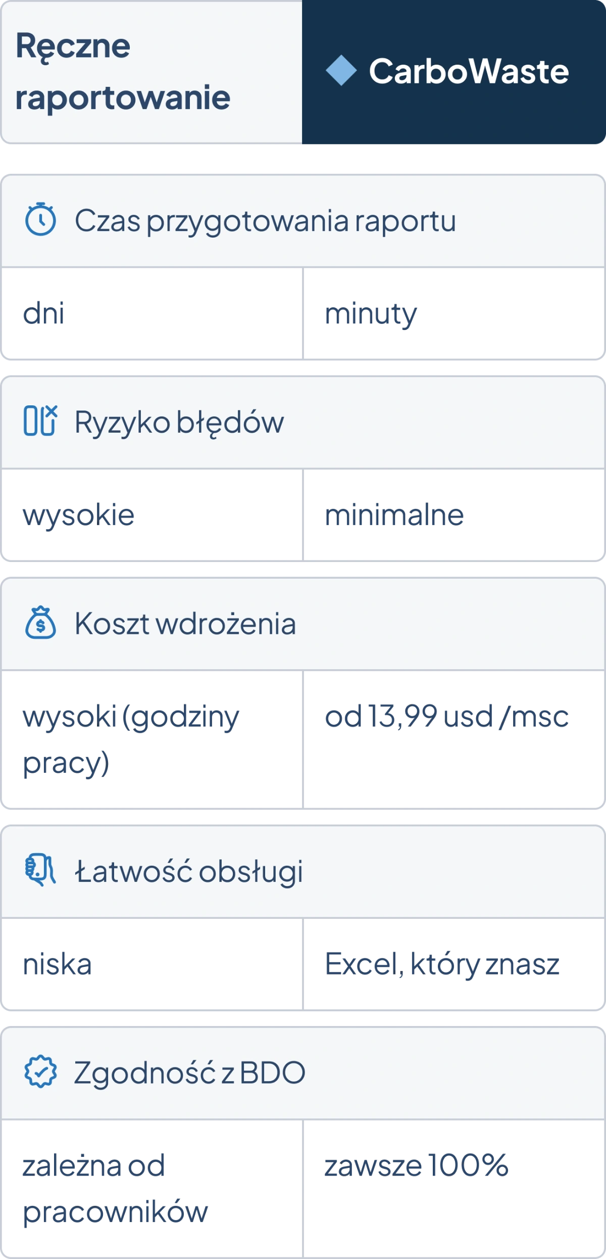 Nie ryzykuj kar i opóźnień. Dzięki CARBOwaste BDO Twoje raporty są zawsze zgodne z wymaganiami BDO, a proces zajmuje minuty zamiast dni. Dołącz do firm, które już korzystają z naszego rozwiązania.