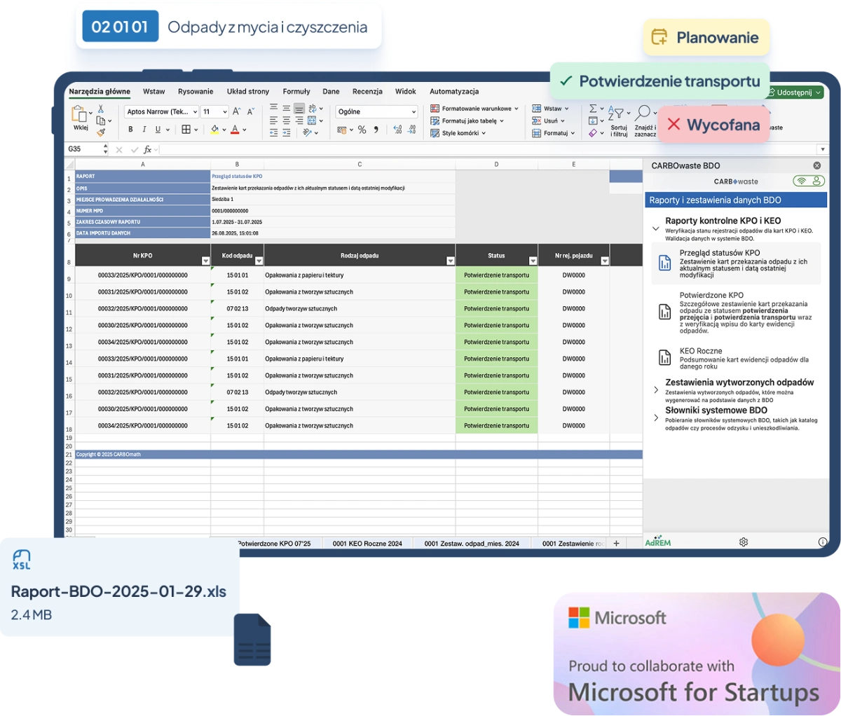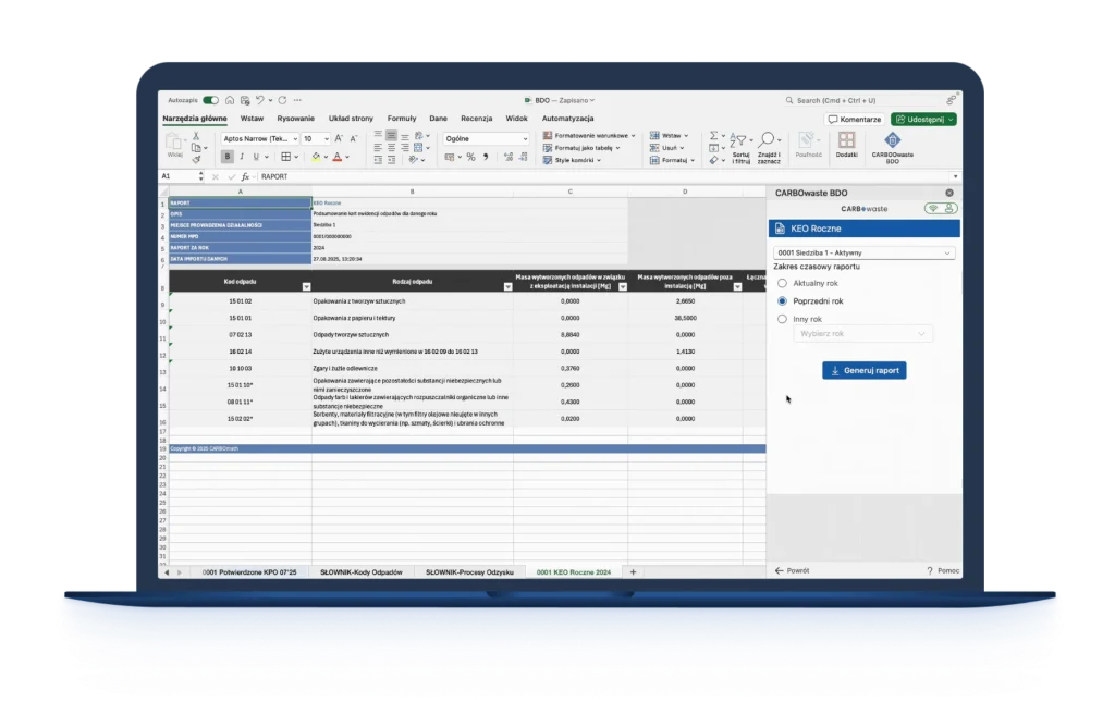 CARBOwaste BDO rozwiązuje te problemy, pobierając dane bezpośrednio z BDO i przetwarzając je w dobrze znanym środowisku Excel. Dzięki automatyzacji i integracji z bazą BDO, zyskujesz pełną kontrolę nad danymi przy minimalnym nakładzie pracy.