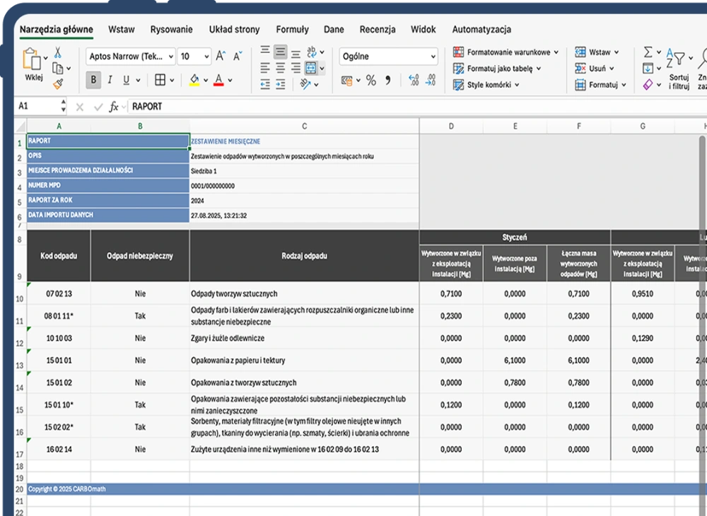 CARBOwaste BDO działa jako dodatek do Excela – nie musisz uczyć się nowego systemu. Wszystkie dane trafiają do arkusza po jednym kliknięciu i są gotowe do analizy.