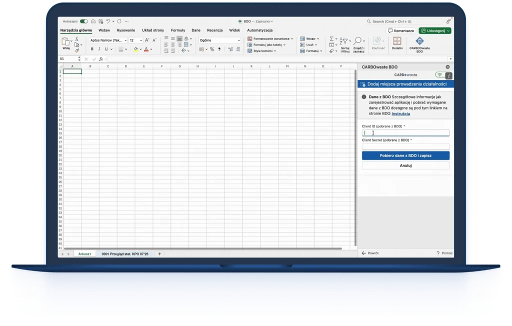 CARBOwaste BDO działa jako dodatek do Excela – nie wymaga instalowania żadnych zewnętrznych programów ani nauki nowych systemów. Korzystasz z narzędzia, które znasz i lubisz.